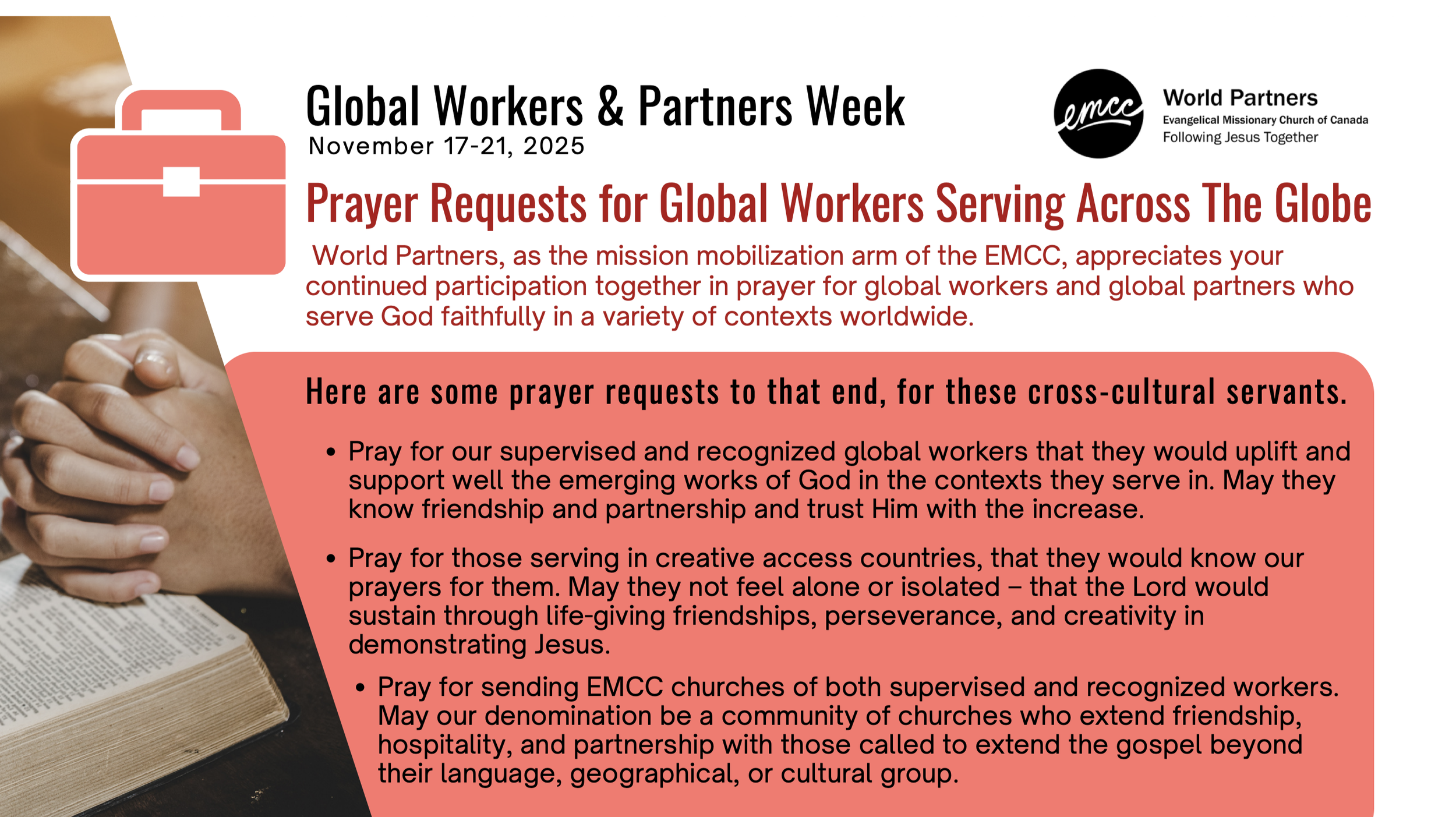 World Partners, as the mission mobilization arm of the EMCC, appreciates your continued participation together in prayer for global workers and global partners who serve God faithfully in a variety of contexts worldwide.